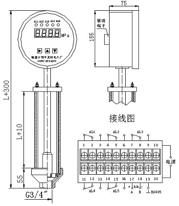 例:表示量程150mm,隔離膜片316L不銹鋼接口,數(shù)碼管LED顯示,2個接點輸出,G3/4鋁合金,4~20mA輸出,工作電源AC/DC220V。