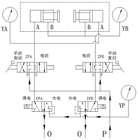 、旋轉(zhuǎn)電磁閥1上的手動(dòng)旋鈕(順時(shí)針),壓力氣體P經(jīng)過(guò)電磁閥1從工作腔A供出,實(shí)現(xiàn)手動(dòng)制動(dòng);制動(dòng)完畢后逆時(shí)針旋回旋鈕,排出制動(dòng)腔氣體