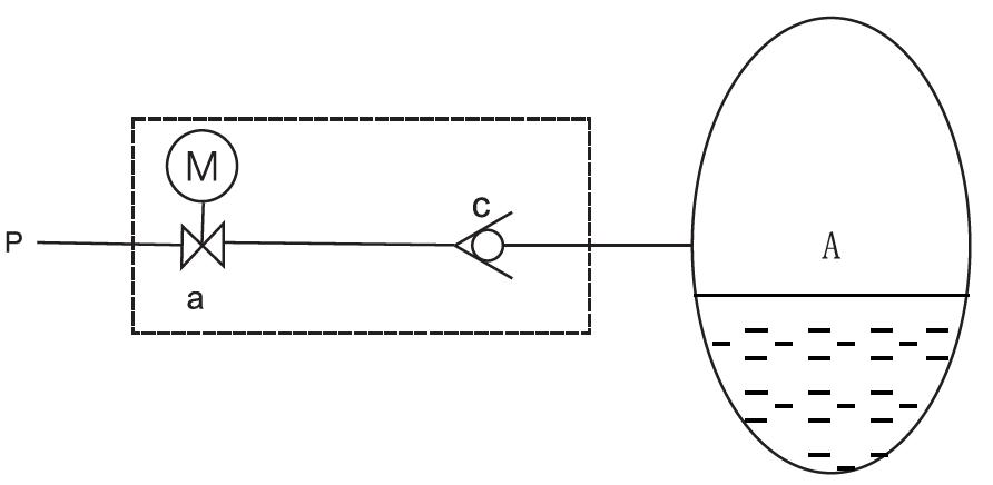 簡易型自動補(bǔ)氣裝置:工作原理如下圖所示,當(dāng)自動補(bǔ)氣條件滿足時,電動球閥得令通電,高壓氣通過電動球閥a、單向閥c補(bǔ)氣。此時閥位指向開啟位置,同時位置開關(guān)輸出補(bǔ)氣信號。建議采用PLC間歇補(bǔ)氣,防止補(bǔ)氣過量。電動球閥帶手動裝置,失電時可實現(xiàn)手動操作。